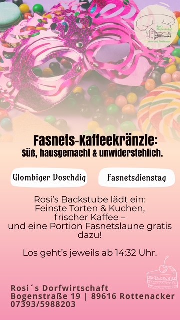 Der Gasthof „Rosi's Dorfwirtschaft“ mit seiner herzhaften schwäbischen Küche im Restaurant liegt in Rottenacker, zwischen Ehingen an der Donau, Laupheim und Biberach. Im Sommer genießen Sie frisch gezapftes Gold Ochsen Bier im Biergarten. Auch Familienfeste, Geburtstagsfeiern und Weihnachtsfeiern bis 80 Personen finden regelmäßig im Nebenraum statt. Unser Saal ist bekannt für Festlichkeiten bis 200 Personen. Die modernen Hotel - Zimmer bieten Ihnen jeglichen Komfort und sind beliebt bei Urlaubern, Geschäftseisenden und Monteuren.
